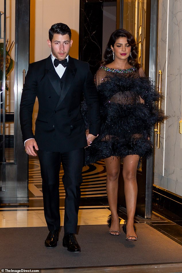 أما نيك وبريانكا شوبرا، فلم يكونا أقل أناقة مما سبقهما، فارتدت بريانكا فستاناً أسود قصير، مزيّن بالريش والدانتيل اللامع، من مجموعة Ralph & Russo، بينما كان زوجها نيك كلاسيكياً ببدلة تاكسيدو سوداء.