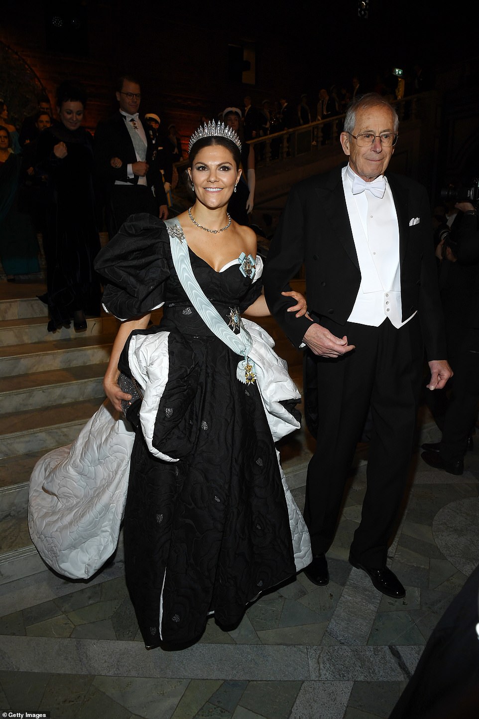 أما الأميرة فيكتوريا فقد لفتت الأنظار إليها بفستانها الأبيض والأسود بقصة الأوف شولدر والذي جاء بقماش ضخم من الأكتاف والأسفل كما تزيّن بذيل أبيض طويل من نفس القماش من مجموعة المصمم السويدي سلام فيشاي، ونسّقت معه تاج مزيّن بالألماس مطابق للقلادة والأقراط.