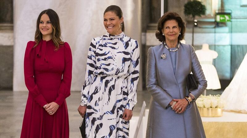 وفي البداية ظهرت كبيرة العائلة المالكة ملكة السويد "سيلفيا" التي تبلغ من العمر 75 عاماً بفستان ساتان باللون البيج من مجموعة المصمم اللبناني العالمي إيلي صعب كما تزيّن بزخارف ذهبية مطابقة للون حقيبة اليد ونسّقت معه تاج أنيق من الكريستال.