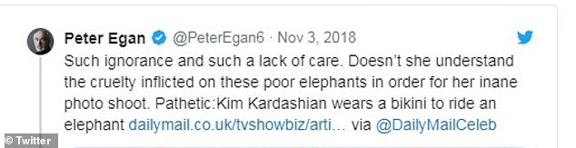 وتأتي هذه الصور بعد خمسة أشهر من انتقادها لتصويرها الفيل وركوبها عليه أثناء رحلتها، حيث غرّد الممثل "بيتر إيغان" عبر حسابه الخاص بمنشور مضحك: "هذا يعتبر جهلًا ونقص رعاية، ألا تعلم كيم كارداشيان كمية القسوة التي تعرضت لها هذه الفيلة المسكينة من أجل التقاط هذه الصورة، إنها مثيرة للشفقة، ترتدي البيكيني لركوب الفيل".
