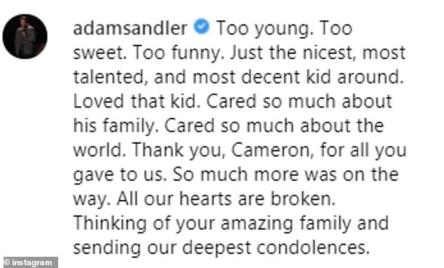 وانتقل العديد من مشاهير هوليوود إلى وسائل التواصل الإجتماعي للتعزية في كاميرون، وخاصة الذين عملوا معه، فقد عبّر آدم ساندلرعن حزنه بقوله: "أحب هذا الطفل، فهو جميل جداً ومضحك، كما أنه الاكثر موهبة على الإطلاق، شكراً لك يا كاميرون على كل ما قدمته لنا، لقد كسرت قلوبنا، أرسل تعازي العميقة لعائلته".