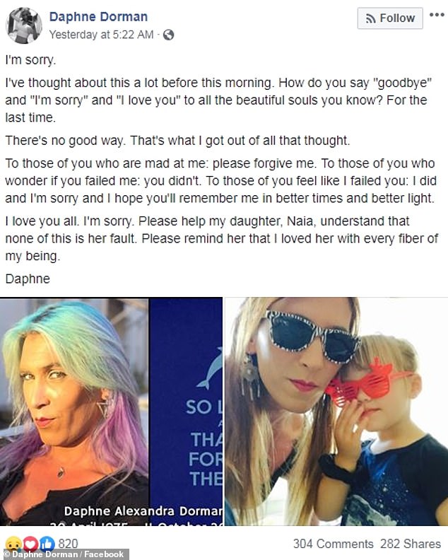 لكن مكتب مبادرات المتحولين جنسياً في سان فرانسسكو أكّد عبر صفحته الخاصة على تويتر بأن دافني قد انتحرت وذلك عقب نشرها رسالة انتحار واضحة عبر حسابها الخاص على فيس بوك تودّع فيها أصدقائها.