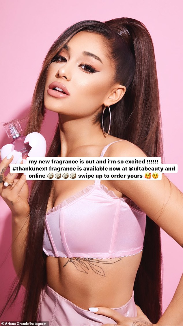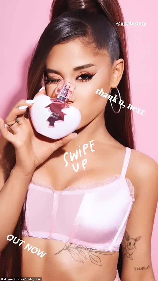 شاركت "آريانا غراندي"، البالغة من العمر 26 عامًا، متابعيها الذين يبلغ عددهم 162 مليون متابع عبر موقع "إنستغرام" سلسلة صور ترويجية لعطرها الجديد الذي استوحي اسمه من اسم ألبومها الأخير Thank U Next، فتظهر مُرتدية ملابس نوم وردية مؤلفة من قطعتين؛ حمالة صدر بشيالات سباغيني كشفت وشمها على شكل أوراق أشجار، وتنورة قصيرة من الجلد.