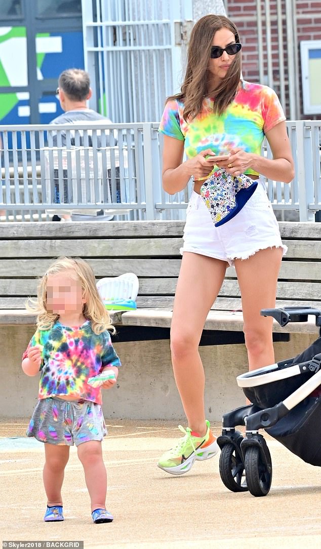 وبحسب صحيفة "ديلي ميل" البريطانية، كانت إيرينا برفقة ابنتها يوم الثلاثاء الماضي في منتزه للألعاب المائية في نيويورك، حيث ارتدت العارضة كروب توب مزين بنقشة التاي الداي الرائجة حاليًا، كشف رشاقة خصرها.