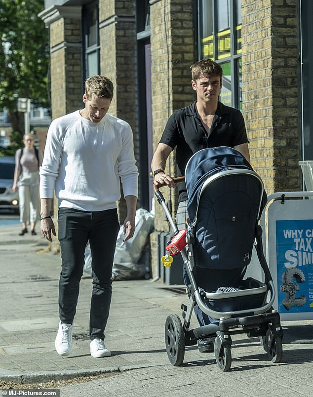 رصدت عدسات الباباراتزي المخرج "داستن بلاك"، البالغ من العمر 44 عامًا، يتجوَّل برفقة زوجه الذي يصغره بـ19 عامًا في شوارع مدينة لندن بينما يجران عربة طفلهما بين الأحياء للاستمتاع بأشعة الشمس.