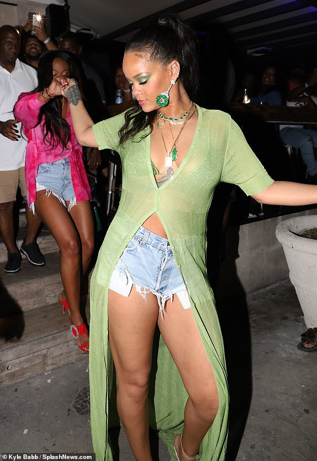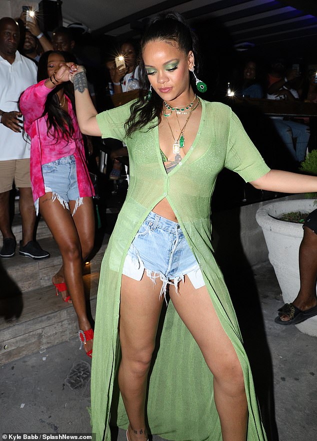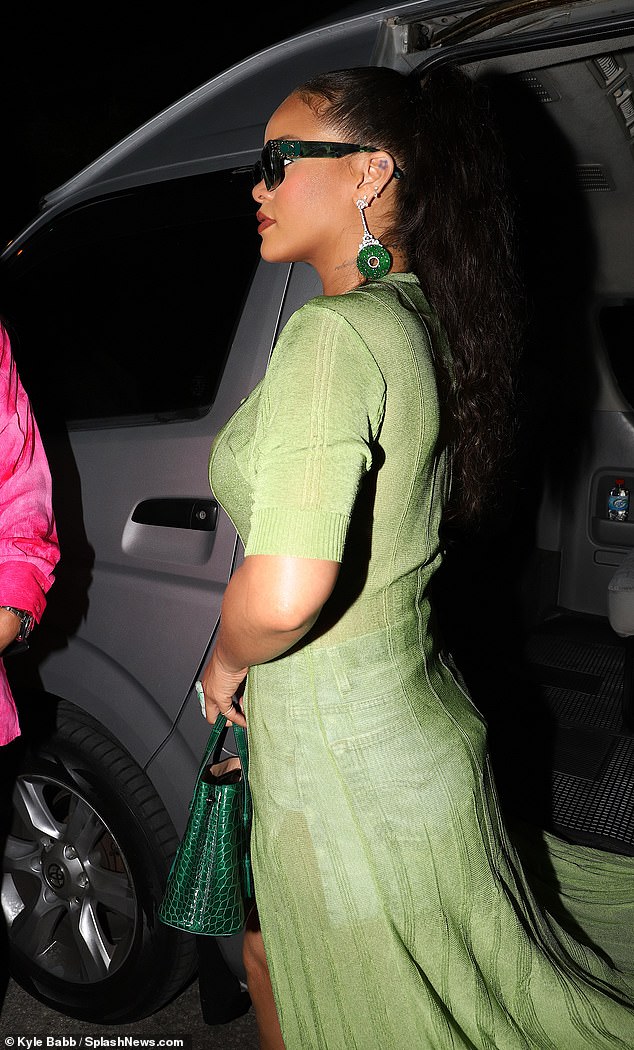 استوحت "ريهانا"، البالغة من العمر 31 عامًا، إطلالتها الخضراء من طائر الطاووس، فارتدت قميص أخضر طويل شيفون من العلامة التجارية Jacquemus يبلغ سعره 406 جنيه استرليني، نسَّقته بحمالة صدر خضراء برَّاقة رفيعة، وهوت شورت دنيم أزرق كشف عن ساقيها الطويلتين.