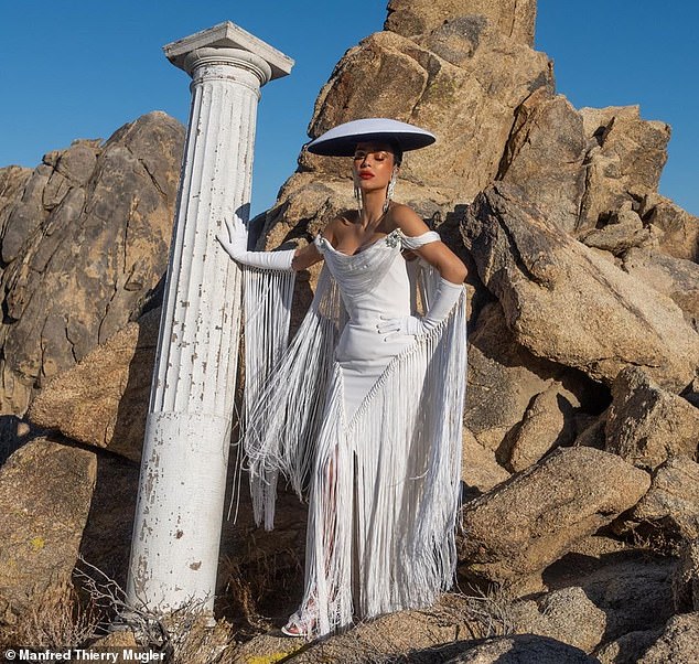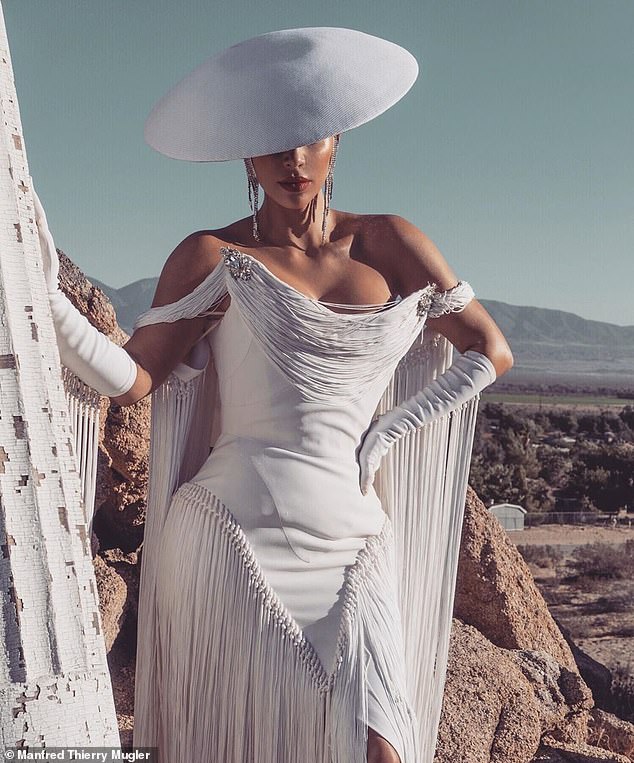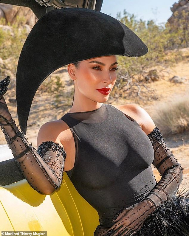 ومن بين الأزياء التي اختارتها، أطلت "كيم" بفستان باللونين الأبيض والأسود من توقيع المصمم الفرنسي الشهير "تيري موغلر"، واتسم التصميم بالحدة مع تحديد الخصر وإبراز الجانبين، فضلًا عن إكمال إطلالتها بقفازين، مع اعتماد ضفيرة جانبية طويلة للغاية، ومكياج قوي، تميز بالأحمر الجريء للشفتين ومكياج سموكي للعينين، واختيار أقراط طويلة مدببة ذهبية.