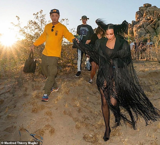 ورغم مرور عدة أيام على الحدث، قررت "كيم" نشر صور لما وراء كواليس جلسة التصوير التي اتخذت صحراء كاليفورنيا موقعًا لها، فظهرت داخل سيارة غولف مُرتديةً فستانها الأبيض الأنيق برفقة طاقم العمل. وفي لقطة أخرى، يساعدها أحد الأفراد على هبوط منحدر بينما اختارت حذاء رياضيًا لتسهيل حركتها.