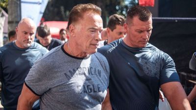 توجَّه "أرنولد شوارزنيجر" إلى مكان عمله برفقة حيوانيه الأليفين؛ الحمار "لولو" والحصان المقزم "ويسكي" يوم الأربعاء الماضي.