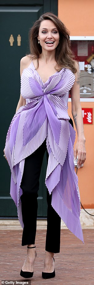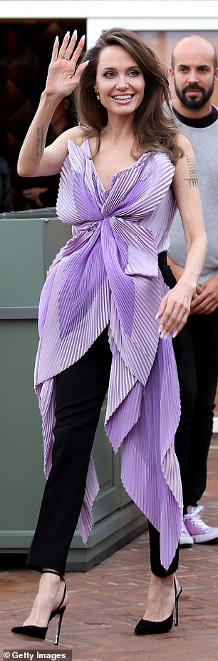 وبدت "جولي" غاية في الأناقة والأنثوية بإطلالتها الأرجوانية المُبهرة من توقيع دار الأزياء الفرنسية "جيفينشي"، حيث تألَّقت مُرتدية توب من درجات الأرجواني جاء بتصميم الفراشة فقد تزيَّن بطيات أنيقة منحتها لمسة من الدراماتيكية، كما جاء بقصة غير مٌتماثلة الأطوال، ونسَّقت إطلالتها ببنطال أسود، وزادت من طولها طولًا بانتعال حذاء ذي كعب عالٍ أسود.