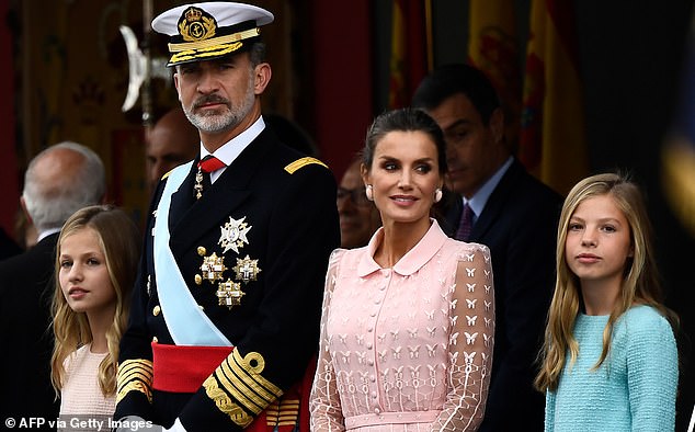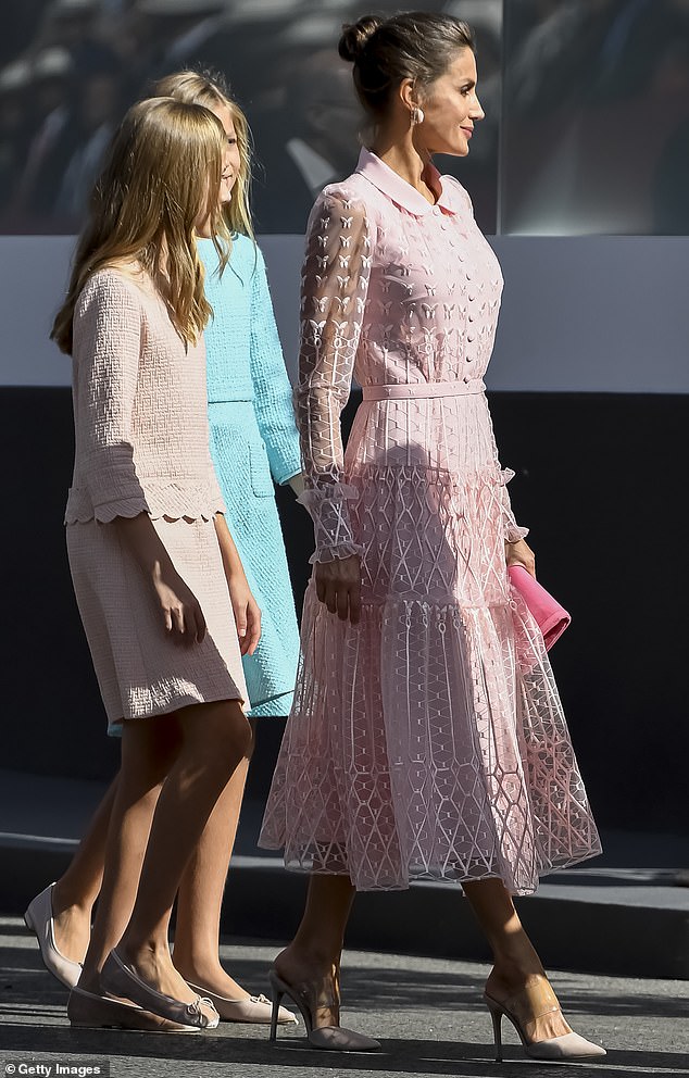 خطفت ملكة إسبانيا "لتيسيا" الأنظار بإطلالتها الأنثوية الوردية التي اختارتها لحضور احتفال بالعيد الوطني لإسبانيا برفقة زوجها الملك "فيليب" السادس وابنتيها الأميرتين "ليونور" و"صوفيا".