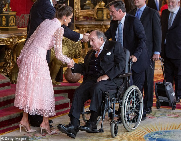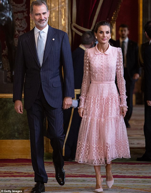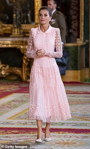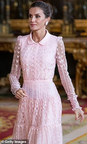 تألَّقت الملكة "ليتيزيا " مُرتديةً فستان وردي ماكسي من دار الأزياء الإسبانية " Felipe Varela"، جاء بأكمام طويلة من قماش الشيفون الشفاف منحها لمسة رومانسية حالمة، وما زادها جمالًا مكياجها الخفيف من درجات الوردي، وتسريحة شعرها المرفوعة الكلاسيكية.