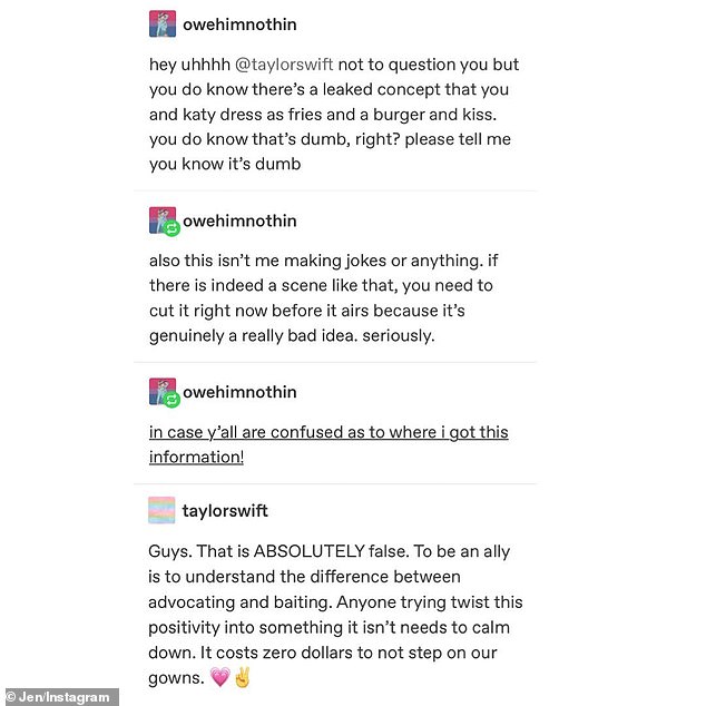 وردًا على هذه التكهنات والفرضيات الخاطئة، نفت "تايلور سويفت" الادعاءات على طريقتها الخاصة عبر إصدار أغنية جديدة تحت عنوان You Need To Calm Down، وعلَّقت على تساؤلات أحد المستخدمين عبر موقع "إنستغرام" الذي طالبها بكشف حقيقة علاقتها بـ"بيري" والرد قبل ازدياد الأمور سوءًا.
