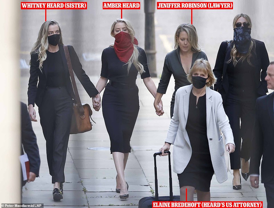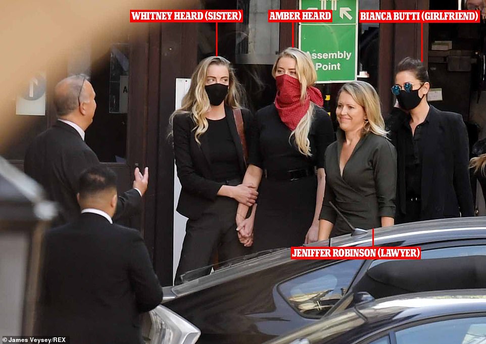 اقتربت "آمبر هيرد" (34 عامًا)، التي كانت تغطي وجهها بوشاح أحمر منقط، من المحكمة جنبًا إلى جنب مع شقيقتها "ويتني" ومحاميتها "جينيفر روبنسون"، قبل أن تنضم حبيبتها "باتي" (38 عامًأ) إليهم بالقرب من المدخل.