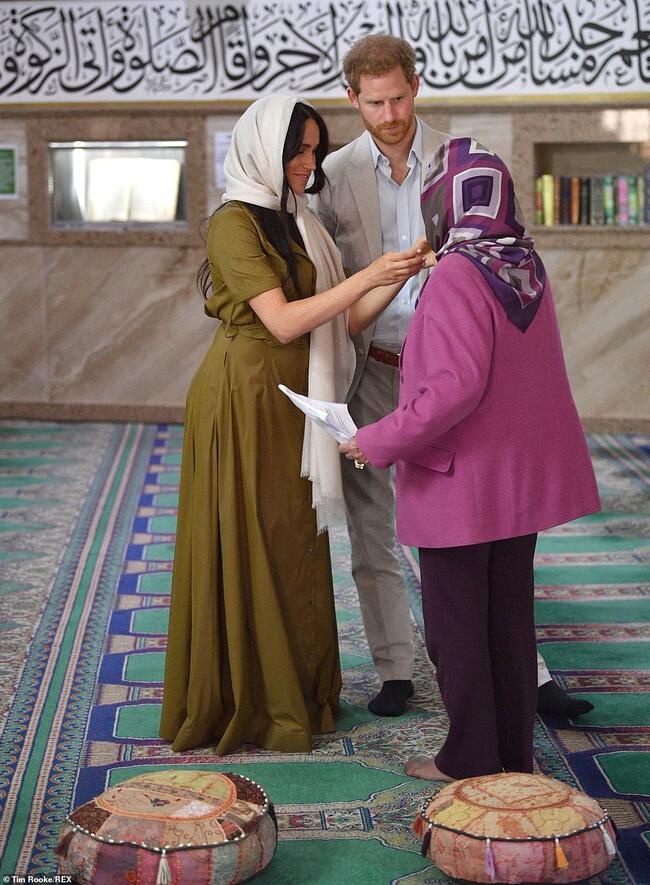 والتقطت الكاميرات لقطات لطيفة خلال زيارتها الروحانية، ففي إحدى الصور تُسارع "ميغان" لإصلاح حجاب إحدى النساء، وفي أخرى تخلع هي وزوجها حذائهما قبل الدخول إلى المسجد، بينما تُعانق إحدى الفتيات بمودة ومحبَّة.