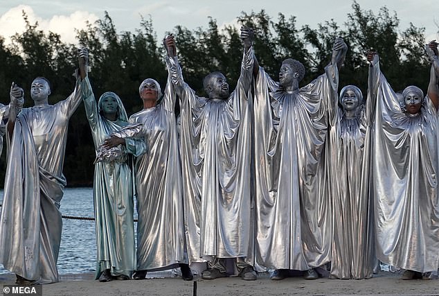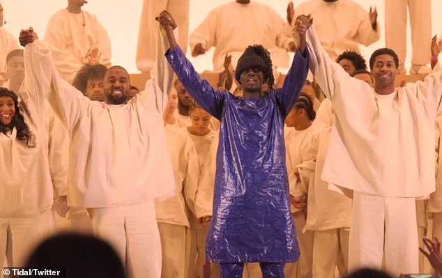 رصدت عدسات الباباراتزي "كانييه ويست" مطليًا بالكامل باللون الفضي من رأسه حتى أخمص قدميه، في حين ارتدى زيًا فضفاضًا فضيًا برَّاقًا جاء بطيات من جهة الياقة أشبه ما يكون بعباءة، وأكمل إطلالته بجوارب فضيةَّ وحذاء بنفس اللون. من جهة أخرى اعتمد المشاركون في العمل ذات الإطلالة.