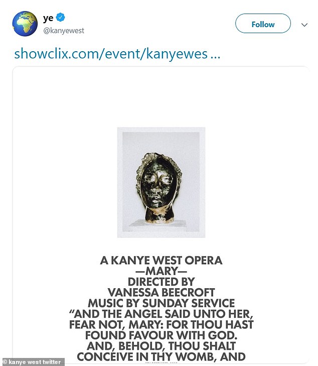 وقبل العرض بعدة أيام، نشر "ويست"، زوج نجمة تلفزيون الواقع "كيم كارداشيان"، تغريدة عبر حسابه على موقع "تويتر" ترويجًا لعرضه الأوبرالي الذي أشرف على إخراجه "نيكول بيكروفت" برفقة جوقة "صنداي سرفيس".