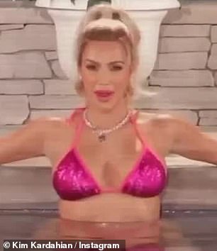 وشاركت "كيم" (39 عامًا) متابعيها عبر موقع "إنستغرام" مقطع فيديو تُقلِّد فيه "إيلي وودز"، فاستعرضت منحنيات جسدها مُرتدية بكيني مؤلف من قطعتين باللون الوردي، وفي لقطة أخرى تترأس طاولة الاجتماعات لتتحدث عن ورق المراحيض على أنه قضية دولية.