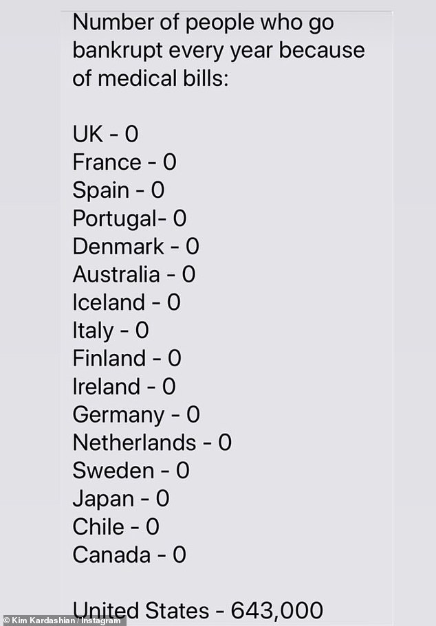 وسلطت "كيم" الضوء على أكثر المشاكل المالية التي مرَّ بها العالم في السنوات الأخيرة، وشاركت إحصائية مثيرة للقلق عبر خاصية "إنستغرام ستوري" بشأن عدد الأشخاص الذي تعرضوا للإفلاس بسبب الفواتير الطبية سنويَا، حيث يقدر عدد الأشخاص المفلسين في الولايات المتحدة الأمريكية ما يقارب الـ643 ألف شخص، بينما لم تسجل أي عملية إفلاس في كل من: المملكة المتحدة، وفرنسا، وألمانيا، واليابان، وأيسلندا، وشيلي، وكندا.