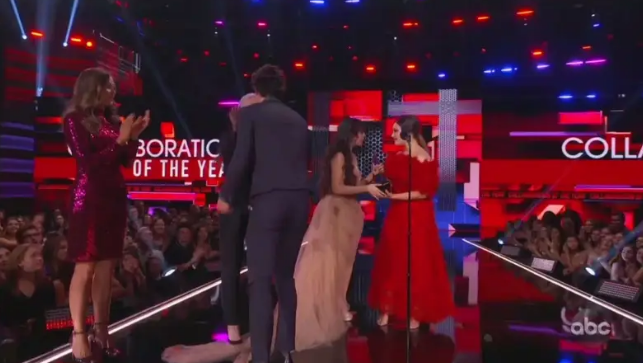 تألقت كاميلا وحبيبها النجم شون مينديز في حفل جائزة الموسيقى الأمريكية هذا العام، ولفتت الأنظار بإطلالة جذابة كادت تتحول إلى كارثة، عندما داست الممثلة الأمريكية "جيمي لي كرتيس" على فستانها، وفي هذه الصورة يبدو أن شون كان يحذر جيمي.