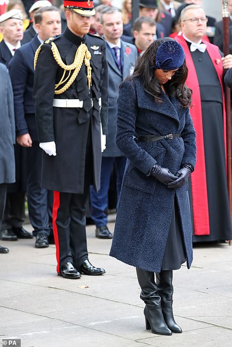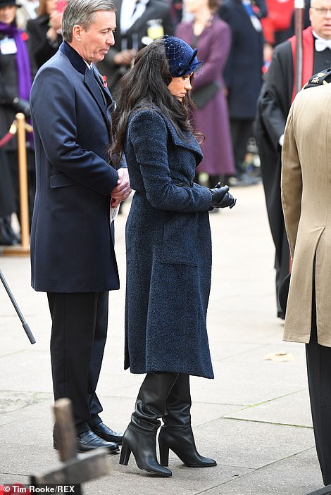 وخطفت "ميغان ماركل" الأنظار إلى إطلالتها الداكنة الكلاسيكية، فارتدت معطفًا أنيقًا بلون الأزرق الداكن نسَّقته بقبعة بحرية عصرية من توقيع المصمم "فيل تريسي"، وزادت من طولها طولًا بانتعال حذاء أسود ذي كعب عالٍ من توقيع مصممة الأزياء البريطانية "فيكتوريا بيكهام"، وتزيَّنت بأقراط بسيطة وقفازات جلدية.
