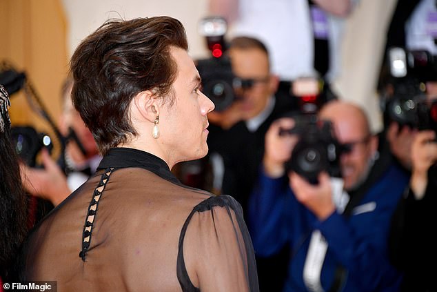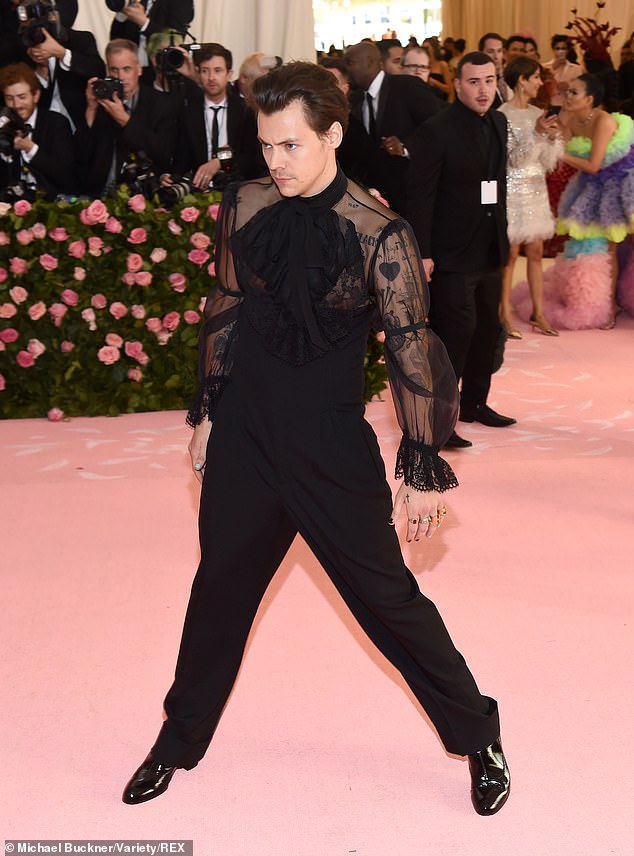 فوفق ما نشرته صحيفة "ديلي ميل" من صور، لفت هاري (25 عامًا)، الأنظار بإطلالته التي طغت عليها اللمسات الأنثوية، حيث ارتدي بدلة سوداء من "غوتشي" لها بلوزة ذات أكمام وأجزاء شفافة عند الصدر تزينت بقطع من الدانتيل.