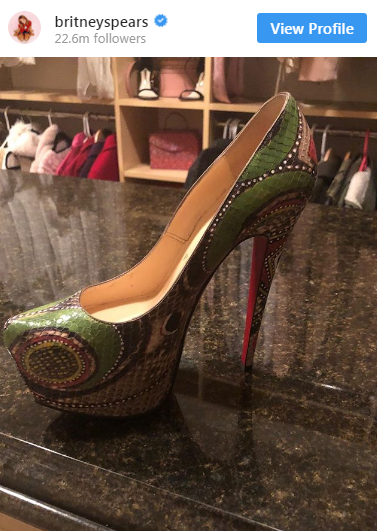 علقت بريتني على الصورة وقالت: "اشتريت أول حذاء لي من كريستيان لوبوتان من جلد الثعبان منذ 4 أعوام.. ملحوظة: لم أرتديه من قبل".