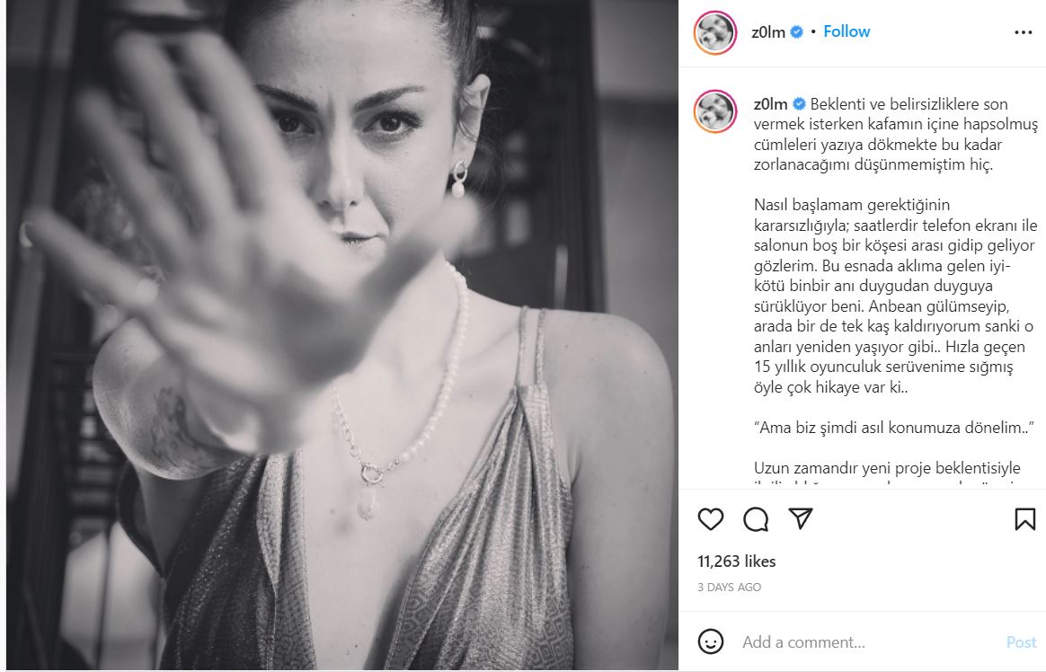وتابعت أوزلم اعلانها اعتزال التمثيل في البيان وأضافت: "لم أكن قد فكّرت أو قررت بكيفية بدء الموضوع فقد كانت عيوني تتجه بين شاشة الهاتف وزاوية غرفة المعيشة لساعات طويلة، لقد مرّ شريط مسيرتي التمثيلية والتي استمرت لمدة 15 عام أمامي وكأنني أعيش هذه اللحظات والقصص في مغامراتي التمثيلية".