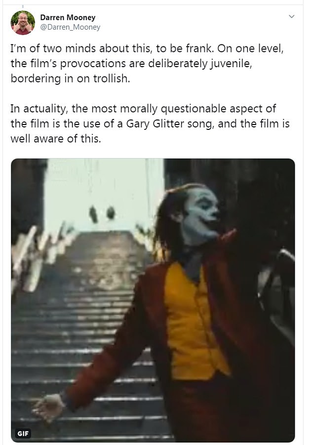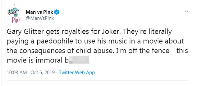 وعلَّق أحد المستخدمين: " غاري غليتر يحصل على نسبة من عائدات فيلم Joker، إنهم يدفعون لمعتدي على الأطفال من أجل استخدام موسيقاه في فيلم يتحدث عن عواقب الإساءة للأطفال."