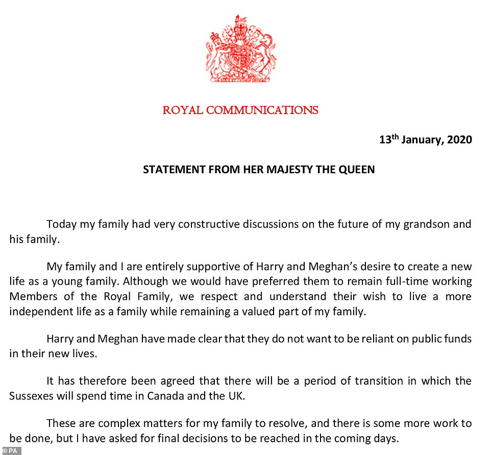 وأصدرت صاحبة الجلالة بياناً عاطفياً عقب الاجتماع سمحت فيه لدوقي ساسكس بالاستقالة من منصب العائلة الكبير كما تأسفت على تخليهما عن واجباتهما الملكية وتقسيم وقتهما بين كندا والمملكة المتحدة، فقالت : "أجرينا اليوم مناقشات بناءة حول مستقبل حفيدي وعائلته فأنا والعائلة المالكة ندعم بالكامل رغبة هاري وميغان في إنشاء حياة جديدة كأسرة شابة، وعلى الرغم من أننا كنا نفضل أن يبقيا عضوين متفرغين إلا أننا نحترم رغبتهما في أن يعيشا حياة أكثر استقراراً".