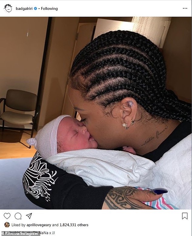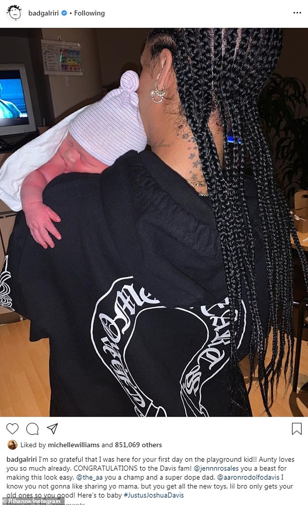 شاركت "ريهانا" متابعيها عبر حسابها على موقع "إنستغرام" صورة لطيفة تجمعها بابن صديقتها حديث الولادة "جاستن جوشوا"، حيث تظهر في الصورة بشعر مُسرَّح على شكل ظفائر رفيعة بينما تحتضن الطفل بكلتا يديها ووجها يُلامس وجهه الصغير، وكتبت: "خالة أوه نا نا".