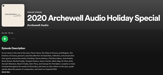 يذكر أن حلقة The Holiday Special من سلسلة البودكاست الجديدة، التي تنتجها شركة Archewell Audio and Gimlet، تضم مجموعة من الحكايات والقصص الشخصية من الضيوف حول العالم بما في ذلك: "جيمس كوردن" والسير "إلتون جون".