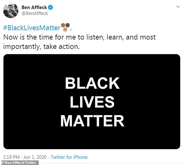 وشارك "أفليك" تغريدة عبر حسابه على موقع "تويتر" نشر فيها صورة سوداء كتب عليها "Black Lives Matter"، وأرفقت بتعليق، جاء فيه: "الآن إنه الوقت لاستمع، لأتعلم، والأهم أن أتخذ رد فعل".