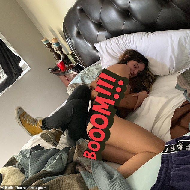 وفي صورةٍ شاركتها بيلا على حسابها الخاص على إنستغرام أمس الأحد، ظهرت عارية الصدر مع امرأة مجهولة على سريرها متخذةً وضعاً حميمياً حيث كانتا تعانقان بعضهما البعض بينما غطتا صدرهما العاري ببعضهما.