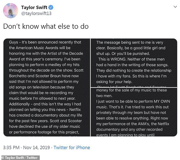 ومن خلال رسالة نشرتها تايلور عبر صفحتها الشخصية أخبرت متابعينها بأنه قيل لها "يجب أن تكوني فتاة صغيرة جيدة وتصمتي وإلا ستعاقبي"، كما ناشدتهم بالقيام بحملة نيابة عنها كما طالبت الفنانين الآخرين المرتبطين برجال الأعمال بالتحدث لأجلها، فقالت: "هذا خطأ كبير فلم يكن يد لهؤلاء رجال الأعمال بكتابة الأغانيي كما أنهم لم يفعلوا شيئاً وأنا أنشأ العلاقة الجيدة التي أمتلكها مع معجبي لذلك أطلب المساعدة منكم".