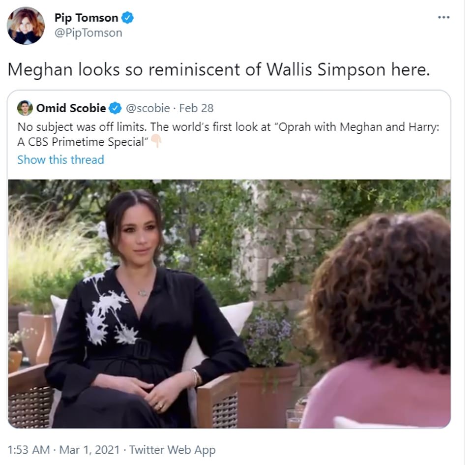 كتب أحد مستخدمي تويتر: "أعتقد أن ميغان تحاكي مظهر ديانا بالزي الأسود وكحل العيون الثقيل، وقد صففت شعرها مثل واليس سيمبسون".