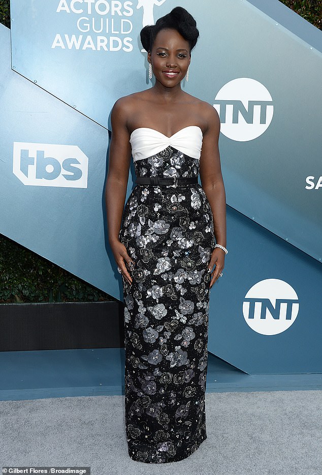 تألقت لوبيتا بفستان انيق من علامة "لوي فيتون"، تميز بلونه الأسود المغطى بتطريزات براقة على اشكال ورود، مع خصر مزين بحزام لإبراز رشاقته وقصّة صدر توحي بشكل فيونكة باللون الأبيض.