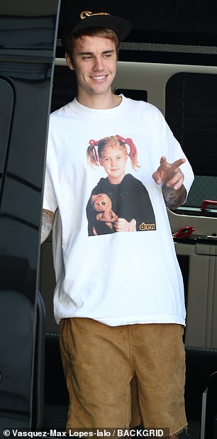 واختار "بيبر" إطلالة غريبة مؤلفة من تيشيرت أبيض طُبع عليها صورة النجمة الأمريكية " درو باريمور" في مرحلة الطفولة نسَّقه بشورت بيج، وارتدى جوارب فوشية طويلة وشبشب أبيض أبيض رُسم عليه وجه تعبيري مبتسم.