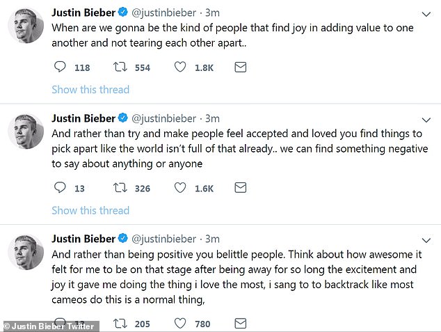 ويبدو أن تعليق مورغان أزعج جاستين بشكل كبير، حيث غرّد عبرحسابه على "تويتر" : "تخيلي لو أنك قضيتِ نصف الوقت الذي قضيته في الضحك على حساب الناس، في بناء الشعوب وتشجيعهم على الإيجابية، ما يؤلمني حقاً هو أنه لديك السلطة لإحداث التغيير"، وأضاف "بدلاً من أن تكوني إيجابية، أنت تحطِ من قدر الناس، فكري كم كان من الرائع بالنسبة لي أن أعود لخشبة المسرح بعد أن ابتعدت لفترة طويلة عن الفرح، لقد غنيتُ بطريقة البلاي باك مثل ما يفعل الكثير من المغنيين، وهذا أمر طبيعي"، كما قال "متى سنكون من الناس الذين يجدون السعادة في إضافة القيم لبعضنا، لا في الذم والسخرية".