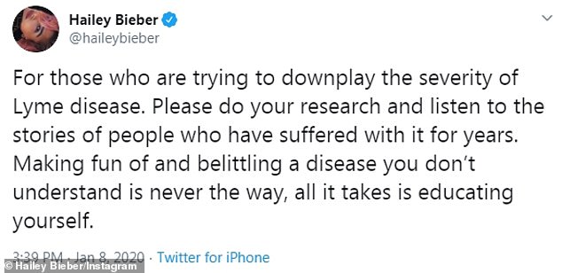 وكتبت هايلي عبر المنشور: "بالنسبة لأولئك الذين يحاولون التقليل من شدة مرض لايم يرجى إجراء بحث والاستماع إلى قصص الأشخاص الذين عانوا من ذلك لسنوات، فالتقليل من شأن المرض الذي لا تفهم فيه شيئاً ليس هذه الطريقة المطلوبة، فكل ما يتطلبه الأمر هو تثقيف نفسك".