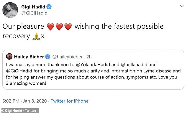 وأضافت لكلامها: "أريد أن أقول شكراً جزيلاً لكل من جيجي حديد وبيلا حديد ويولاندا حديد على إمدادي بالكثير من المعلومات والوضوح حول مرض لايم وللمساعدة في الإجابة على أسئلتي حول مسار العمل والأعراض وما إلى ذلك أحبكن أيتها السيدات الرائعات".