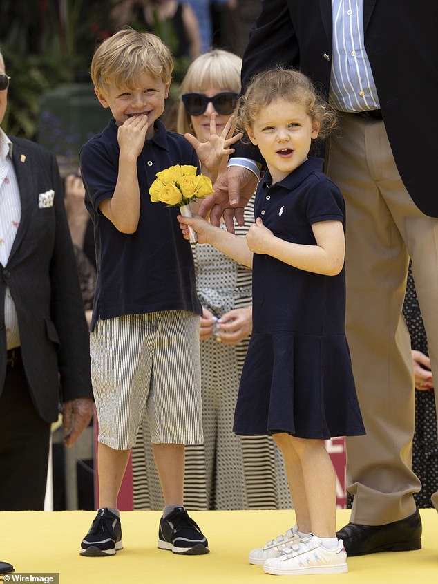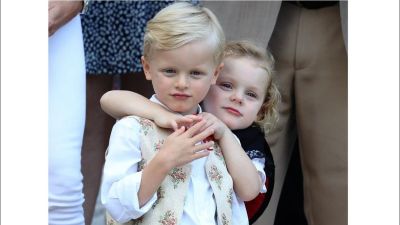 شوهد الأمير جاك الصغير وهو يحتضن شخصية باتريك ستار، بينما كان يرتدي بلوزة كحلية مع شورت أبيض، بينما كانت شقيقته ترتدي فستاناً كحلياً أيضاً.