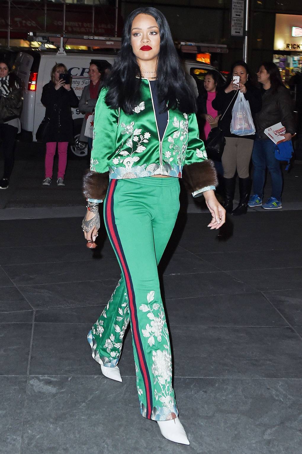واختارت ريهانا البدلة السوداء من دولتشي أند غابانا كإطلالة رجالية بامتياز، مع قصة البيكسي القصيرة، وانتعلت الكعب العالي والقفازات السوداء.