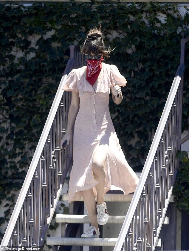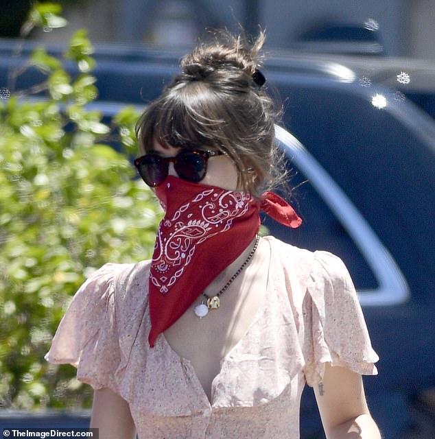 رصدت عدسات الباباراتزي النجمة العالمية "داكونا جونسون" تتنزه في شوارع مدينة لوس أنجلوس، لكن الغريب في الموضوع استبدالها الكمامة بباندانا حمراء، بينما ارتدت فستانًا صيفيًا أنيقًا باللون الوردي وحذاء من العلامة التجارية العالمية "غوتشي" بقيمة 650 دولار.