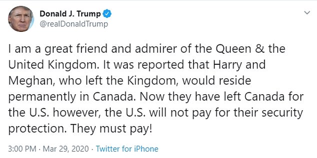 وكتب "ترامب": "أنا صديق رائع ومعجب بالملكة والمملكة المتحدة، وأفيد أن هاري وميغان، اللذين غادرا المملكة، سيقيمان بشكل دائم في كندا. والآن وبعد مغادرتهما كندا للعيش في الولايات المتحدة، فلن تدفع الولايات المتحدة مقابل حمايتهما الأمنية، عليهما دفع فواتيرهما الشخصية".