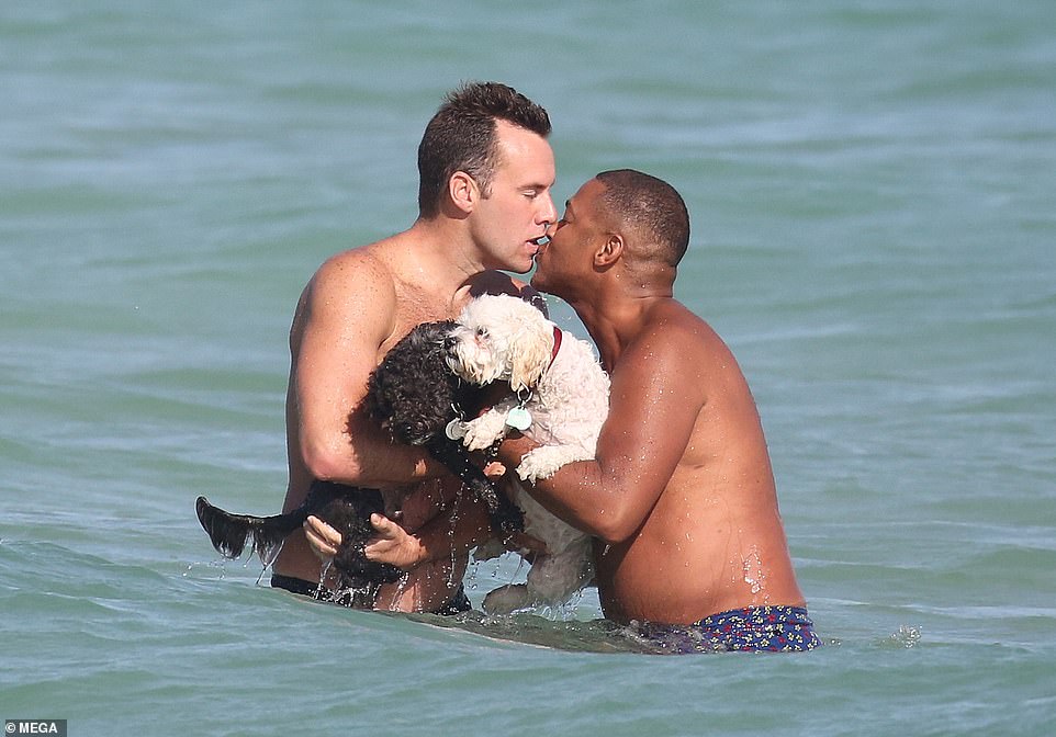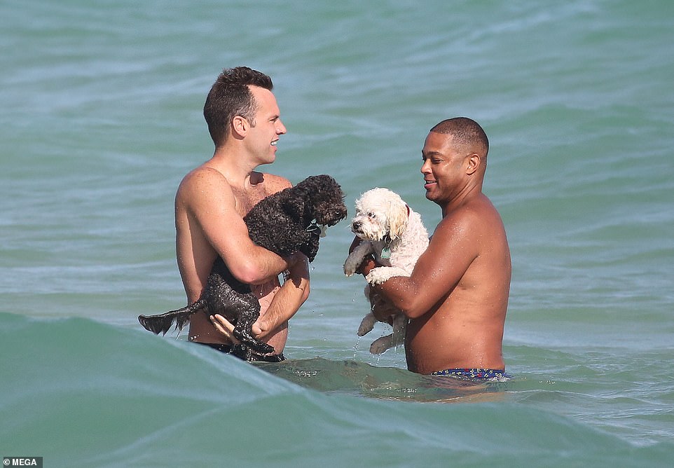 شوهد مذيع قناة CNN "دون ليمون" وخطيبه تيم مالون وهما يستمتعان بإجازة على شاطىء البحر في ميامي برفقة اثنين من الجراء يوم السبت الماضي.