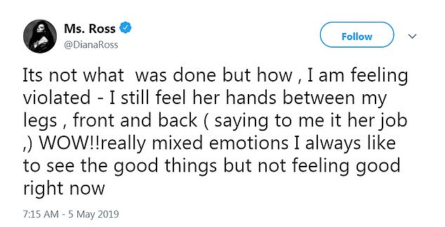 وصرّحت ديانا عبر تغريداتها، أنها تلقي باللوم على إدارة أمن المطار، حيث قالت: "لقد تعاملوا معي كالملوك في مهرجان نيو أورليانز، لكن في المطار كان أسلوبهم سيء جداً"، وأضافت: "لقد دفعني هذا الشىء إلى البكاء في المطار، مازلت أشعر بيديها بين ساقي، شعوري بالإنتهاك كان صعب، لا أشعر بأنني بحالة جيدة الآن".