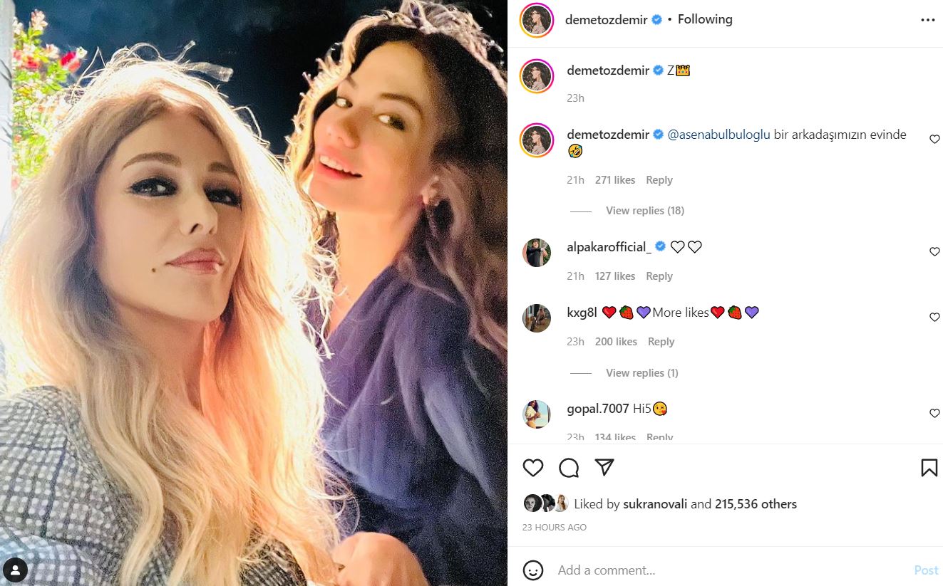 وظهرت ديميت في الصورة برفقة النجمة التركية "زرين تكيندور" والتي كانت هي الأخرى بإطلالة رائعة خطفت بها أنظار المتابعين تحت أشعة الشمس بشعرها الأشقر المميز