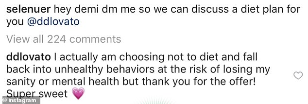 وفي يوم الثلاثاء، قررت "ديمي لوفاتو" الخروج عن صمتها والرد على أولئك الذين يطالبونها باتباع حمية غذائية، فردَّت على تعليق لأحد المستخدمين الذي عرض عليها مساعدتها في إنقاص وزنها عبر حمية غذائية.