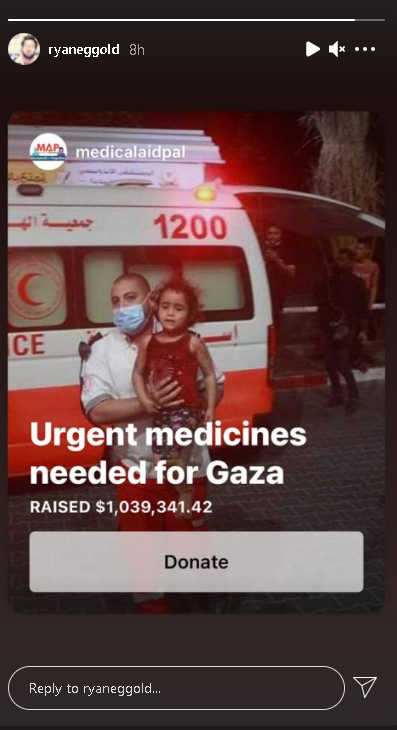وشارك ريان في تمويل جماعي من قبل Medical Aid Pal يدعو فيه للمساعدة في الحصول على الإمدادات الطبية لغزة تزامناً مع ارتفاع عدد القتلى والجرحى.